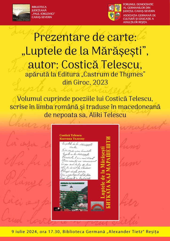 9. Juli 2024, 17:30 Uhr, Deutsche „Alexander Tietz“-Bibliothek Reschitza: