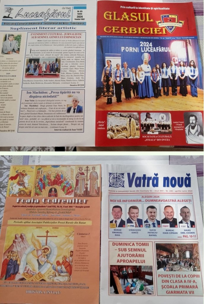 Pot spune că, din acest punct de vedere ,,Banatu-i fruncea”. Foaia Săcoșană, editor Gheorghe Lungu, UZPR, Talpa Țării, editor, Nicolae Toma,UZPR, Curier de Găvojdia, Informația de Bethausen, Foaia Nădrăgeană, Cuvânt Dumbrăvean, toate coordonate de colegul nostru Dumitru Toma,UZPR și redactor Redeșteptarea de Lugoj. Vatra Satului, Ferendia, Ioan Traia, Suflet Nou, Ioan Olărăscu, Revista parohială ,,Arhanghelul” redactor șef Valentin Bugaru, parohia Birda-Timiș, Publicația ,,Din Vatra Satului” editor și redactor șef, Vasile Bele, din Maramureș, membru UZPR, Filiala ,,Mihai Eminescu” Timișoara. Deci se (mai) poate.