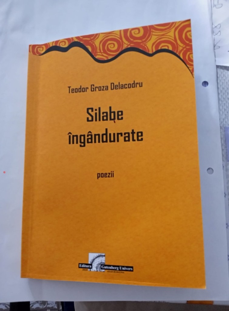 Prezentare de carte: Teodor Groza Delacodru, un nou volum de poezii,, Silabe îngândurate” editura Gutenberg, Arad, cu prefață și postfață de Carina A. Baba și Floare R. Cândea, membre UZPR Filiala Arad. Secvențe relevante despre creația inedită a unui poet de o subtilitate ironică nebănuită, redăm; ,,Poezia locului, fie el sat, oraș țară, poezia anotimpurilor, vorbim,mai ales,de toamnă și iarnă,reprezintă pretexte pentru pasteluri,fiindcă Teodor Groza Delacodru nu se mulțumește cu o simplă descriere în versuri, ci tabloul lui prinde viață, stropit fiind cu picături de suflet”. (Carina A Baba). Ori ,,În concluzie Teodor Groza Delacodru, nu se teme de ,,sfârșitul” său, ci de amurgul cuvintelor. Cu un gard mult prea înalt înspre lumea bântuită de neînțelegeri, poetul, mai puțin grăbit, își repetă la infinit ideile literare. Crezul său liric: pelerin în silabe îngândurate”. (Floare R.Cândea).