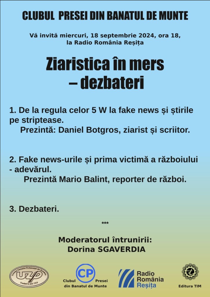Dragi colegi, îmi face mare plăcere să vă invit la o nouă întâlnire a Clubului Presei. Programul pe care îl propunem pentru luna septembrie îl aveți mai sus. Vă așteptăm.