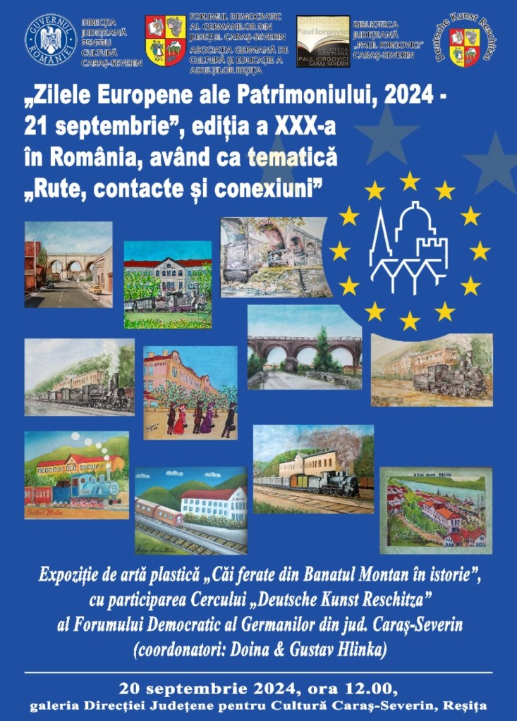 „Zilele Europene ale Patrimoniului, 2024 – 21 septembrie”, ediția a XXX-a în România, având ca tematică „Rute, contacte și conexiuni”: Expoziție de artă plastică „Căi ferate din Banatul Montan în istorie”, cu participarea Cercului „Deutsche Kunst Reschitza” al Forumului Democratic al Germanilor din jud. Caraș-Severin (coordonatori: Doina & Gustav Hlinka).