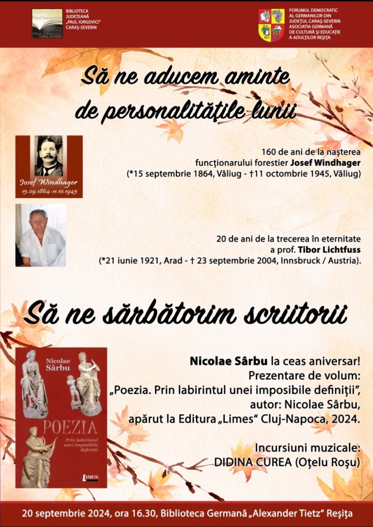 20 septembrie 2024, ora 16.30, Biblioteca Germană „Alexander Tietz“ Reșița: