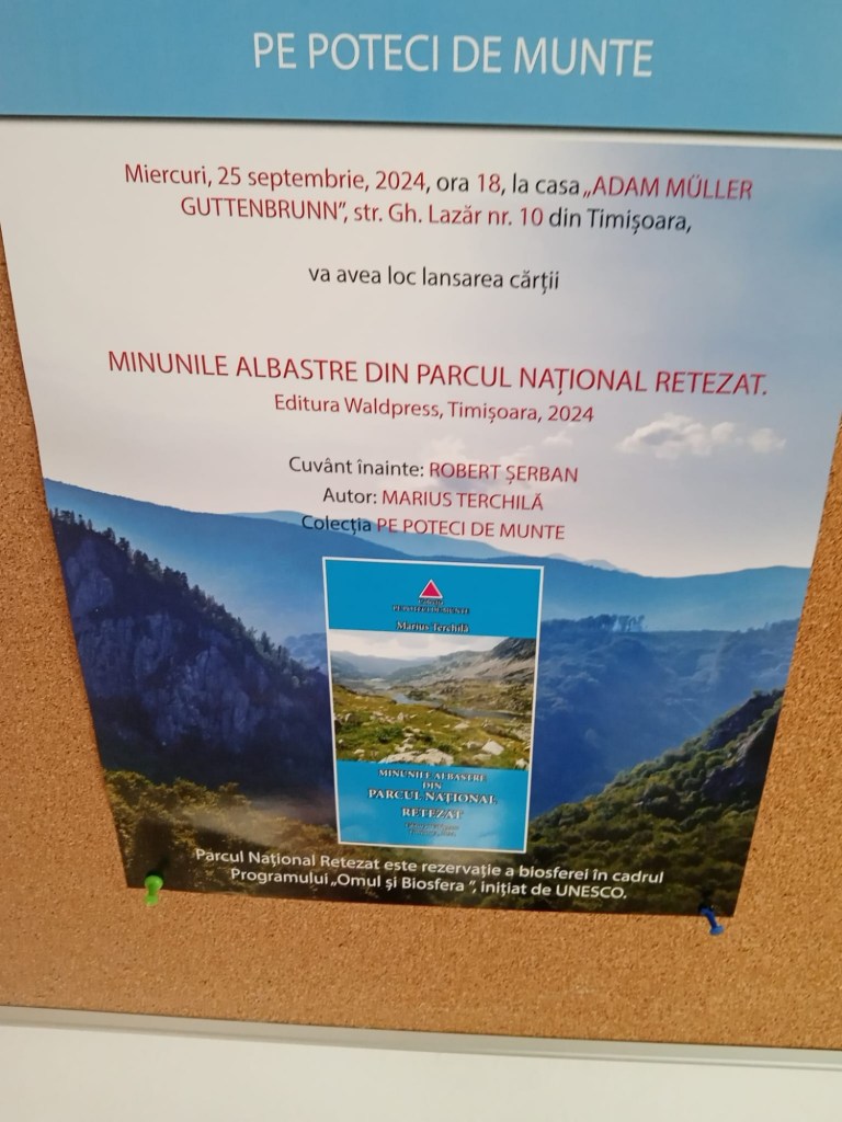 Recent, la Casa germană ,,Adam Muller Guttembrun”, din Timișoara în prezența multor iubitori de drumeții pe cărări de munte, prof. octogenar, Marius Terchilă, a prezentat cartea cu un titlul provocator,,Minunile albastre din Parcul Național Retezat” editura Waldpress, Timișoara 2024. Cu o prefață luminoasă a omului de cultură Robert Șerban din care reproducem o secvență relevantă ,, Fascinat de ceea ce a descoperit de-a lungul vieții pe munții și văile pe care le-a bătut de atâtea ori cu piciorul, Marius Terchilă scrie cald documentat, exaltat,coerent, convins că prin cuvintele sale îi va ajuta pe cititori măcar să-și imagineze ce înseamnă Retezatul, dacă nu chiar să prindă poftă și să pornească în drumeție pe urmele autorului. Cartea sa e mai mult decât un ghid turistic e mărturia unei pasiuni reale și a bucuriei de a fi la înălțime. Mai că-mi vine să mă duc la poalele Retezatului, să pun mâna pe binoclu și să mă plimb agale, cu privirea pe crestele sale”.