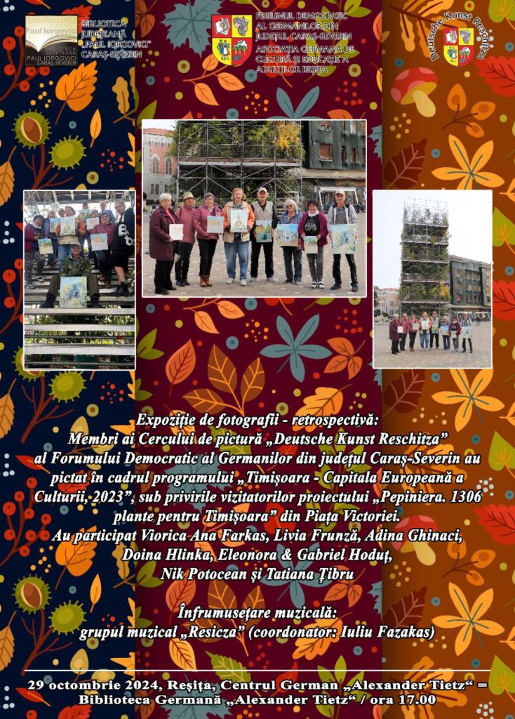 Expoziție de fotografii – retrospectivă: Membri ai Cercului de pictură „Deutsche Kunst Reschitza” al Forumului Democratic al Germanilor din județul Caraș-Severin au pictat în cadrul programului „Timișoara – Capitala Europeană a Culturii, 2023”, sub privirile vizitatorilor proiectului „Pepiniera. 1306 plante pentru Timișoara” din Piața Victoriei. Au participat Viorica Ana Farkas, Livia Frunză, Adina Ghinaci, Doina Hlinka, Eleonora & Gabriel Hoduț, Nik Potocean și Tatiana Țibru.