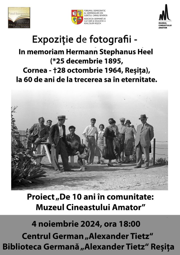 Expoziție de fotografii in memoriam Hermann Stephanus Heel (*25 decembrie 1895, Cornea – †28 octombrie 1964, Reșița), la 60 de ani de la trecerea sa în eternitate.