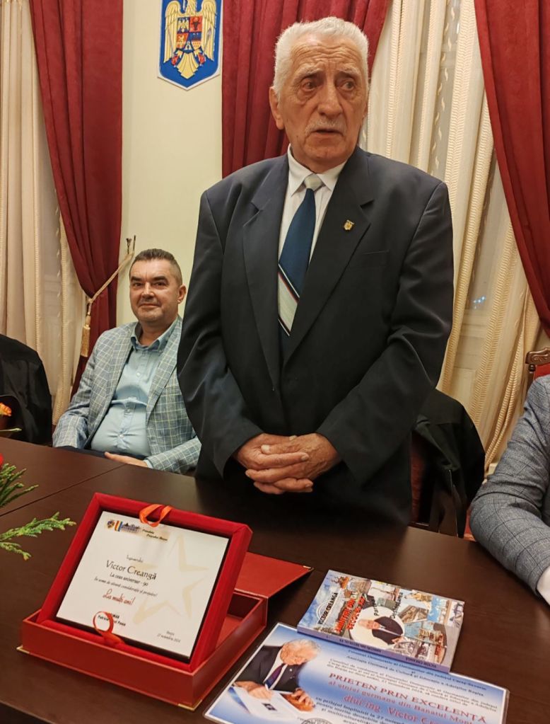 Miercuri, 27 noiembrie 2024, Sala de festivități a Primăriei Orașului Bocșa a găzduit un eveniment de suflet dedicat unei legende vii a locului – ing. Victor Creangă și-a sărbătorit cei 90 de ani de viață alături de familie, de foști colaboratori și prieteni de ieri și de azi. De asemenea, prezenți la eveniment au fost membri ai consiliului local al orașului Bocșa, scriitori și oameni de cultură de la Oravița – dr. Ionel Bota și Cristina Zainea, – dl. Nicu Orăvicean, primarul comunei Berliște, Mirel Patriciu Pascu, primarul orașului Bocșa și Bogdan Pop, viceprimarul Bocșei, precum și scriitorii reșițeni Gheorghe Jurma și Erwin Josef Țigla, cetățeni de onoare ai orașului Bocșa.