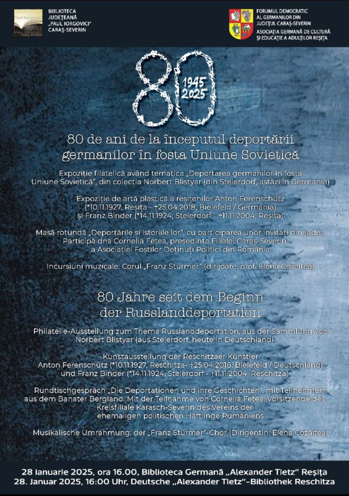 28 ianuarie 2025, ora 16.00, Centrul German „Alexander Tietz“ = Biblioteca Germană „Alexander Tietz“ Reșița: