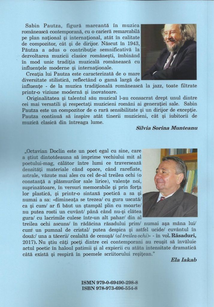 Este vorba despre cartea semnată de Sabin Păutza și conține „Compoziții muzicale pe versuri de Octavian Doclin” (Reșița: TIM, 2025). Sunt zece poeme scrise de Octavian Doclin, alese de maestrul Păutza pentru a le așeza pe note și a le nemuri și prin muzică. Este bine cunoscut faptul că marele compozitor a pus pe muzică multe „poezii scrise în toate limbile pământului” și astfel au luat naștere câteva cărți de lieduri ale acestuia.