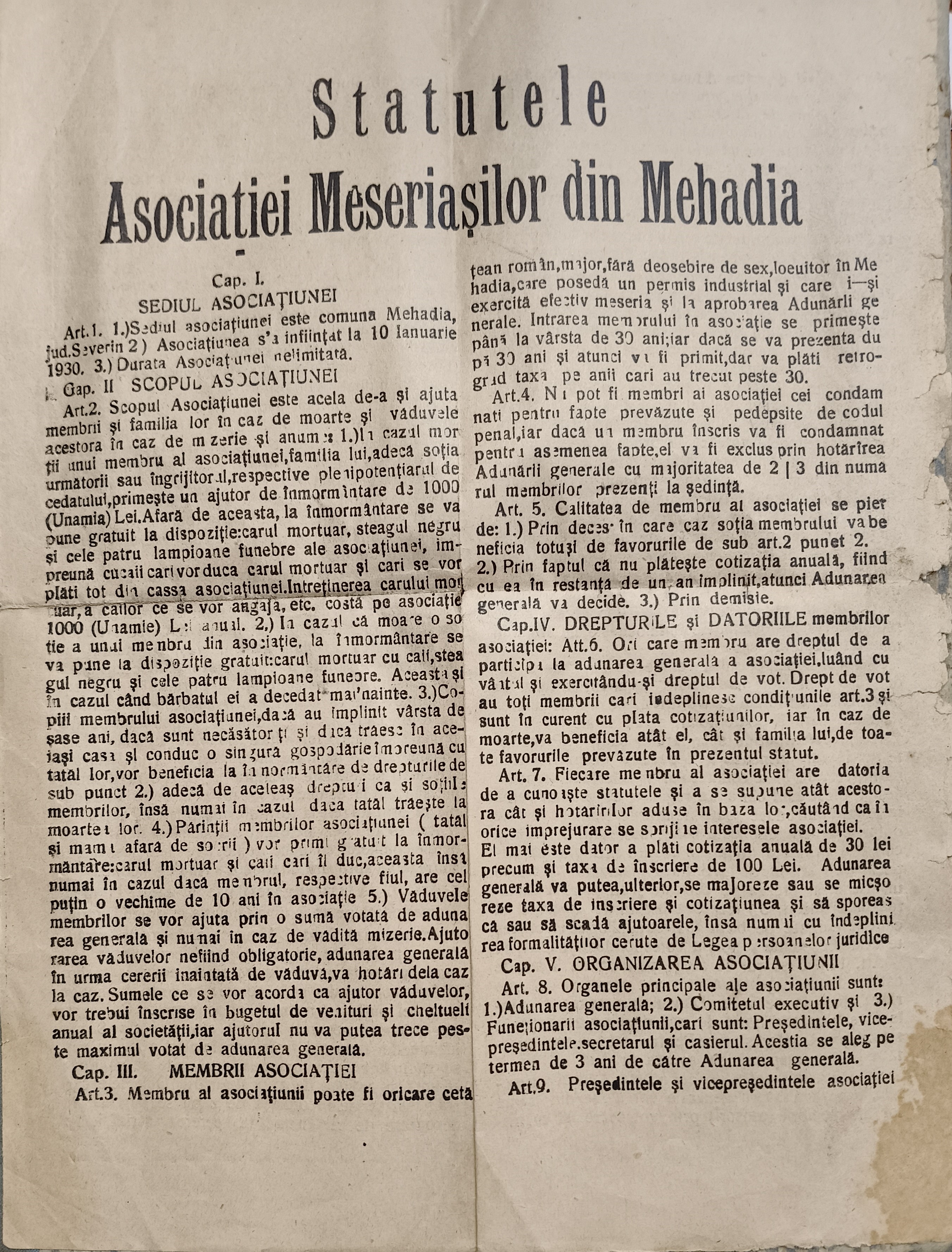 În privința denumirii asociației, aceasta în mulții ani ai săi de funcționare, suportă câteva schimbări de titulatură, beneficiind și de unele modificări ale statutului său de funcționare, devenind în același timp și persoană juridică, act oficializat de către Tribunalul Caransebeș. Astfel, din anul 1888, până în ianuarie 1930, asociația își desfășoară activitatea sub denumirea de ,,Reuniunea Meseriașilor”. Din 10 ianuarie 1930, devine: ,,Asociația Meseriașilor din Mehadia”. Scopul asociației rămâne același: de ajutorare a membrilor și a familiilor lor. Adunarea generală acceptă și votează un nou statut, cuprinzând șapte capitole. Primirea ca membru este condiționată de calitatea de meseriaș (maistor), posesor al unui ,,permis industrial și care își exercită efectiv meseria”. Semnatari ai acestui nou statut sunt menționați în documente: Grigore Popescu – măcelar, Eduward Hirschmann – croitor, Nicolae Bălăcel – pantofar, Iosif Domil – cojocar, Nicolae Feneșan – pantofar, Dănilă Bidiviu – pantofar, Ioan Trapșa – argăsitor, Ioan Bidiviu – argăsitor, Iosif Crăciunescu – zugrav, Ludovic Liegl – pantofar, Carol Ratkovits – tâmplar, Petru Blidariu – pantofar, Anton Slach – curelar, Nicolae Urechiatu – faur.