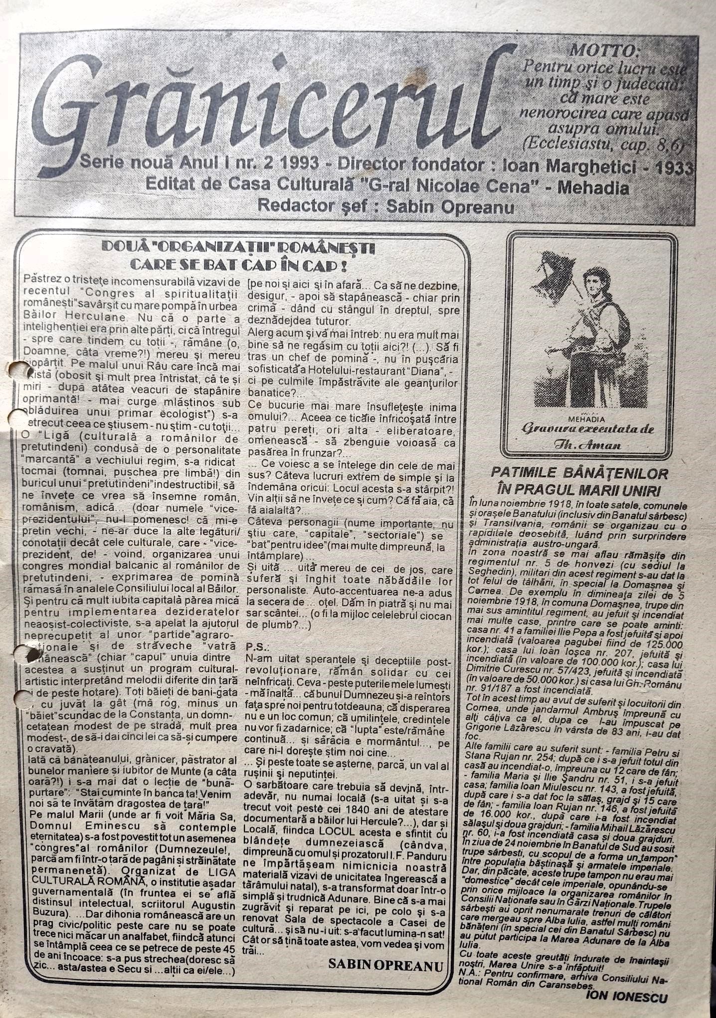 O nouă încercare de a edita o publicație, la Mehadia, are loc în anul 1993. De această dată se încearcă o reeditare, într-o nouă ediție (serie), a gazetei interbelice ,,Grănicerul”, la 60 de ani de la prima sa apariție (1933), publicație pe care am prezentat-o anterior. Inițiativa reeditării ei aparține lui Ion Ionescu (Bloju) și scriitorului Sabin Opreanu. Publicația este editată de Casa Culturală ,,Gen. Nicolae Cena”, din Mehadia, al cărei director era Ion Ionescu. Colectivul redacțional este format din : Sabin Opreanu-redactor șef, Ion Ionescu-secretar de radacție. Redactori: Gruia Cinghiță, Ana Grad, Enache Nedella, G.C. Rusu. Nici de această dată, publicația nu reușește să producă decât două numere .
