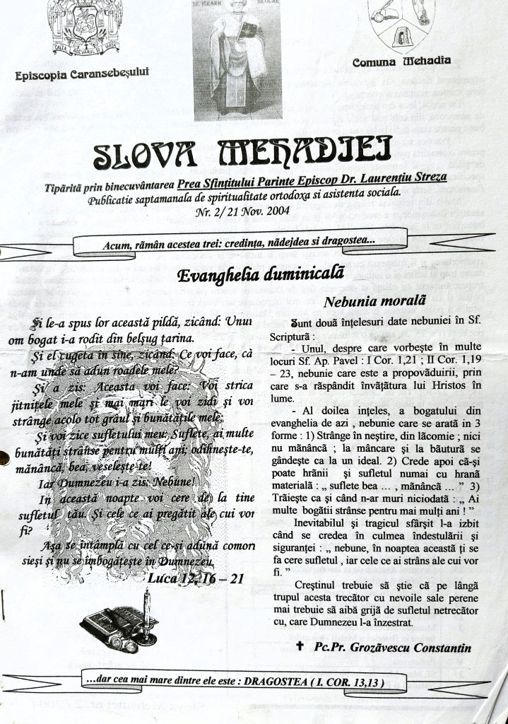 O altă publicație, apărută la Mehadia, pe care o amintim, este ,,Slova Mehadiei”, editată de Parohia Ortodoxă Mehadia, la inițiativa și sub oblăduirea preotului Ciprian Danci. Apariția este una periodică, respectiv săptămânală. Ea se produce în două etape de timp, respectiv, o primă ediție, înițiată în anul 2004, reluată cu un nou număr, într-o nouă serie, în anul 2017. Din colectivul redacțional face parte: Pr. Ciprian Danci, Dragoș Ionescu (Bingo), Maria Cârcu, Alin Panduru. În calitate de președinte este menționat P.S. Dr. Laurențiu Streza, Episcopul Caransebeșului.