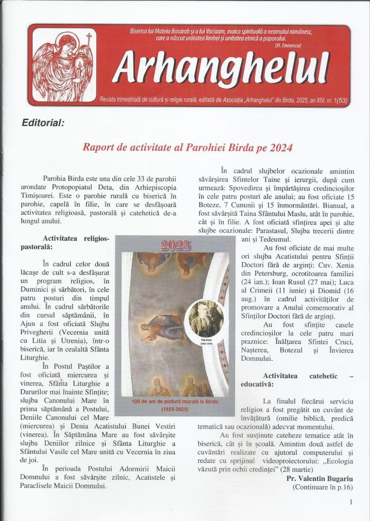 Acest prim număr al revistei „Arhanghelul” pe anul 2025 prezintă necesare pagini de istorie culturală din Banatul istoric, recente apariții editoriale, portrete ale unor personalități, dar și frumoase pagini de literatură. De asemenea, sunt conturate succint cele mai importante evenimente desfășurate la sau de către Parohia Birda la începutul acestui an 2025.