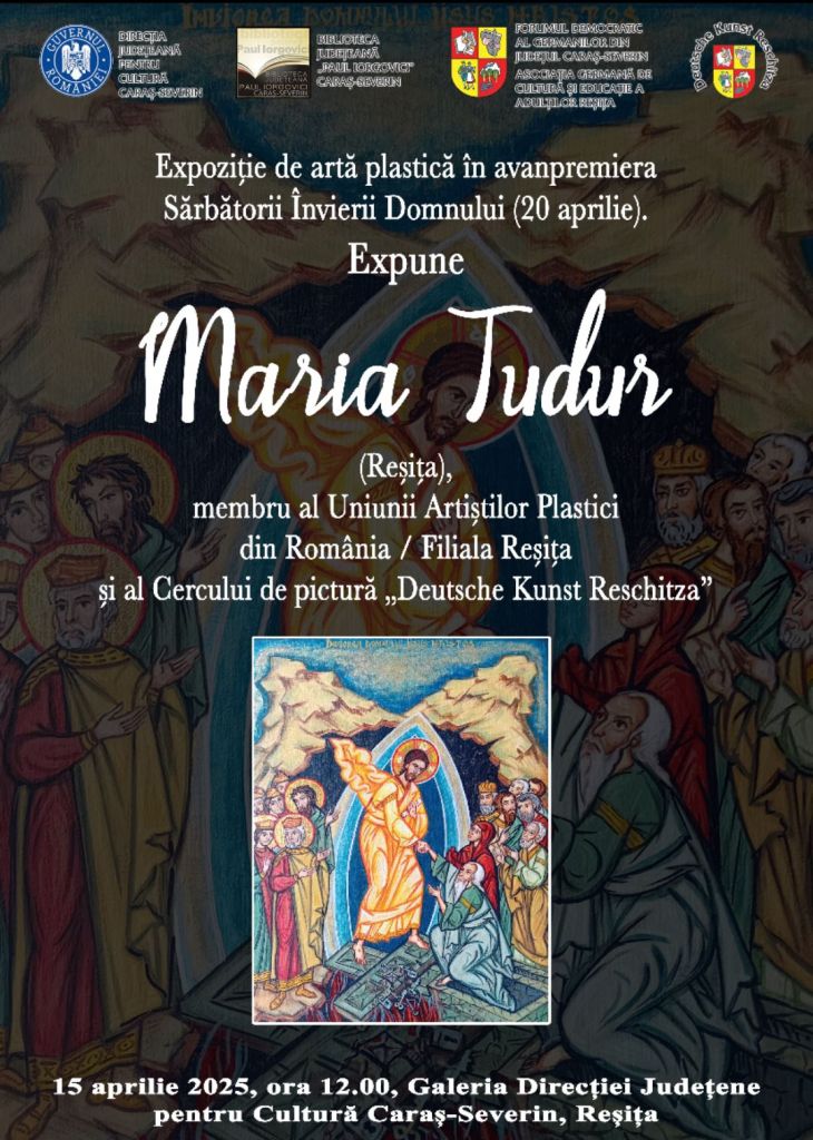 Expoziție de artă plastică în avanpremiera Sărbătorii Învierii Domnului (20 aprilie). Expune Maria Tudur (Reșița), membru al Uniunii Artiștilor Plastici din România / Filiala Reșița și al Cercului de pictură „Deutsche Kunst Reschitza”.
