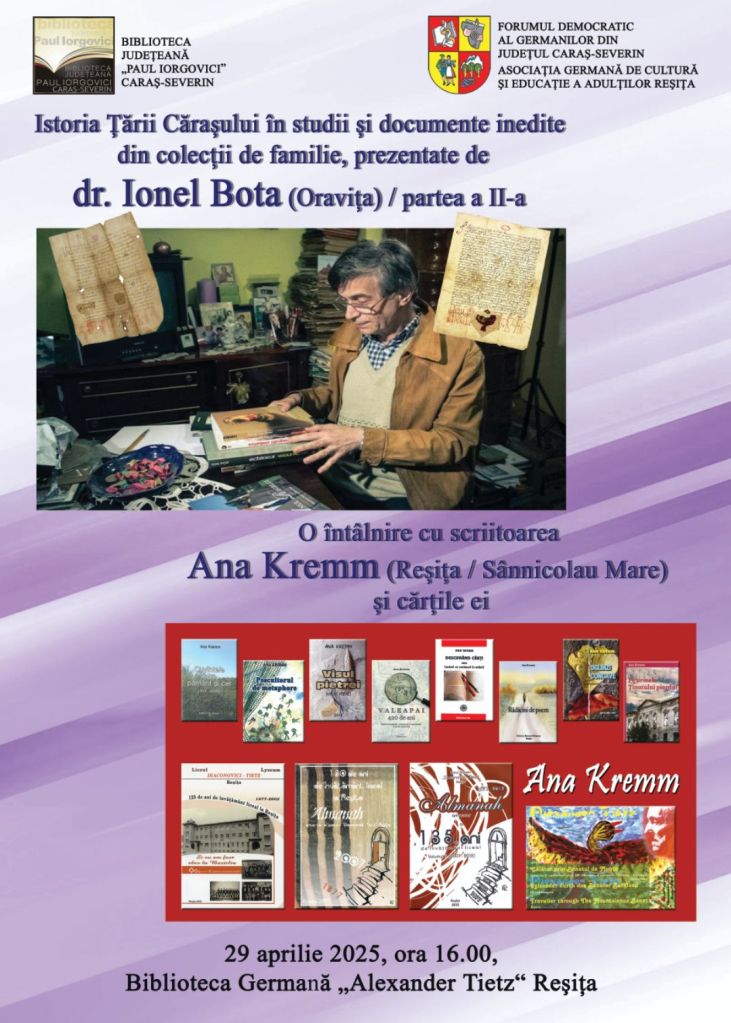 29. April 2025, 16:00 Uhr, Deutsches Jugend-, Dokumentations- und Kulturzentrum / Deutsche „Alexander Tietz“-Bibliothek Reschitza: