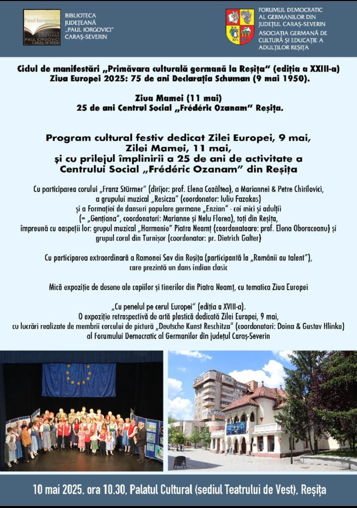Program cultural festiv dedicat Zilei Europei, 9 mai, Zilei Mamei, 11 mai, și cu prilejul împlinirii a 25 de ani de activitate a Centrului Social „Frédéric Ozanam” din Reșița.