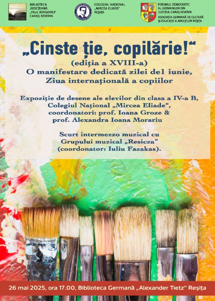 „Lob der Kindheit!“ (XVIII. Auflage): Eine Ausstellung von Zeichnungen der Schülerinnen und Schülern der IV. B Klasse, „Mircea Eliade“-Nationalkolleg, Koordinatoren: Prof. Ioana Groze & Prof. Alexandra Ioana Morariu, anlässlich des 1. Juni, dem internationalen Kindertag.