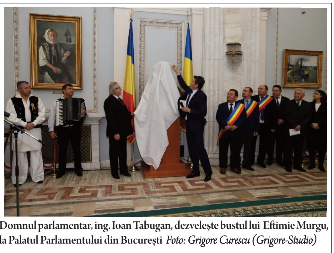 Respectiva reușită este rod al inițiativei, voinței și efortului parlamentarului cărășean, Ion TABUGAN, cu sprijinul mai multor entități locale, asociații sau persoane fizice, din Banat. Un rol special în îndeplinirea respectivului deziderat, l-a avut Societatea culturală ,,Țara Almăjului”, din Timișoara, prin președintele său, prof.univ.dr. Dumitru POPOVICI. Realizare a sculptorului timișorean Aurel Gh. Ardelean, bustul din bronz, este sfințit în data de 3 noiembrie 2019 de către Preasfințitul Părinte Lucian, episcopul Caransebeșului. Montarea și dezvelirea bustului, la Palatul Parlamentului din București, are loc în data de 10 decembrie 2019 în cadrul unei impresionante ceremonii, cu o numeroasă prezență. Alături de organizatori, au participat deputați, senatori, oficialități locale și județene din Banat, scriitori, istorici, jurnaliști. Manifestarea a cuprins în derularea ei și câteva momente artistice, specifice zonei Banatului Montan, susținute de corul liceului de artă ,,Sabin Păutza ” din Reșița și de către rapsodul bănățean Gheorghe Călțun Brancu. Despre semnificația evenimentului și despre personalitatea lui Eftimie Murgu, au vorbit prin cuvântările lor, promotorul acțiunii, parlamentarul Ion Tabugan, senatorul Călin Popescu Tăriceanu, scriitorul Ion Marin Almăjan, prof.univ.dr. Dumitru Popovici și creatorul bustului, sculptorul Aurel Gheorghe Ardelean.