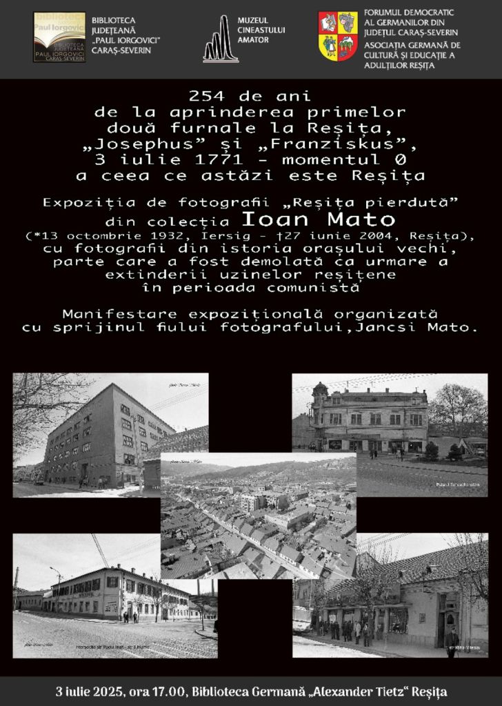Expoziția de fotografii „Reșița pierdută” din colecția Ioan Mato (*13 octombrie 1932, Iersig – †27 iunie 2004, Reșița), cu fotografii din istoria orașului vechi, parte care a fost demolată ca urmare a extinderii uzinelor reșițene în perioada comunistă. Manifestare expozițională organizată cu sprijinul fiului fotografului, Jancsi Mato.
