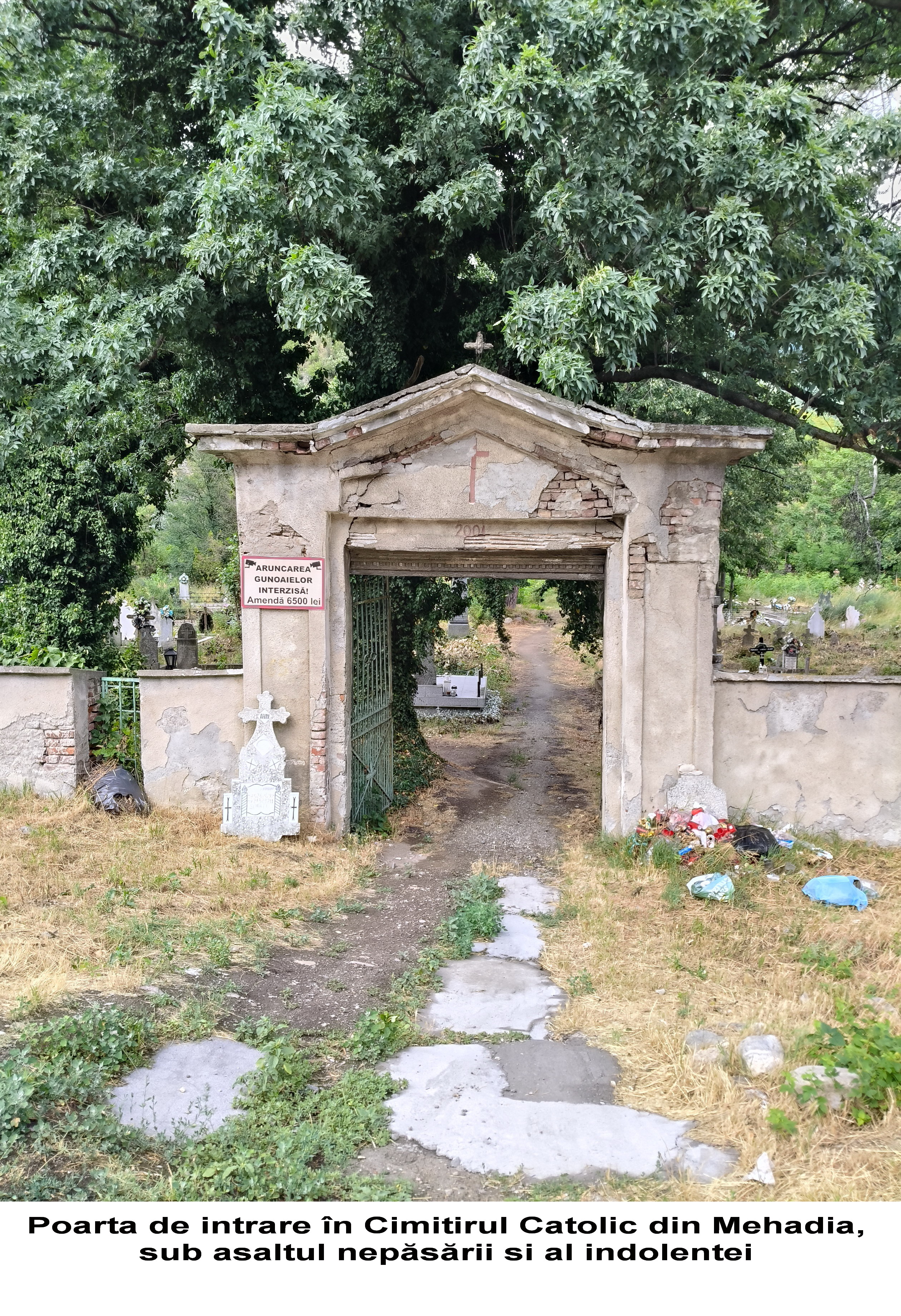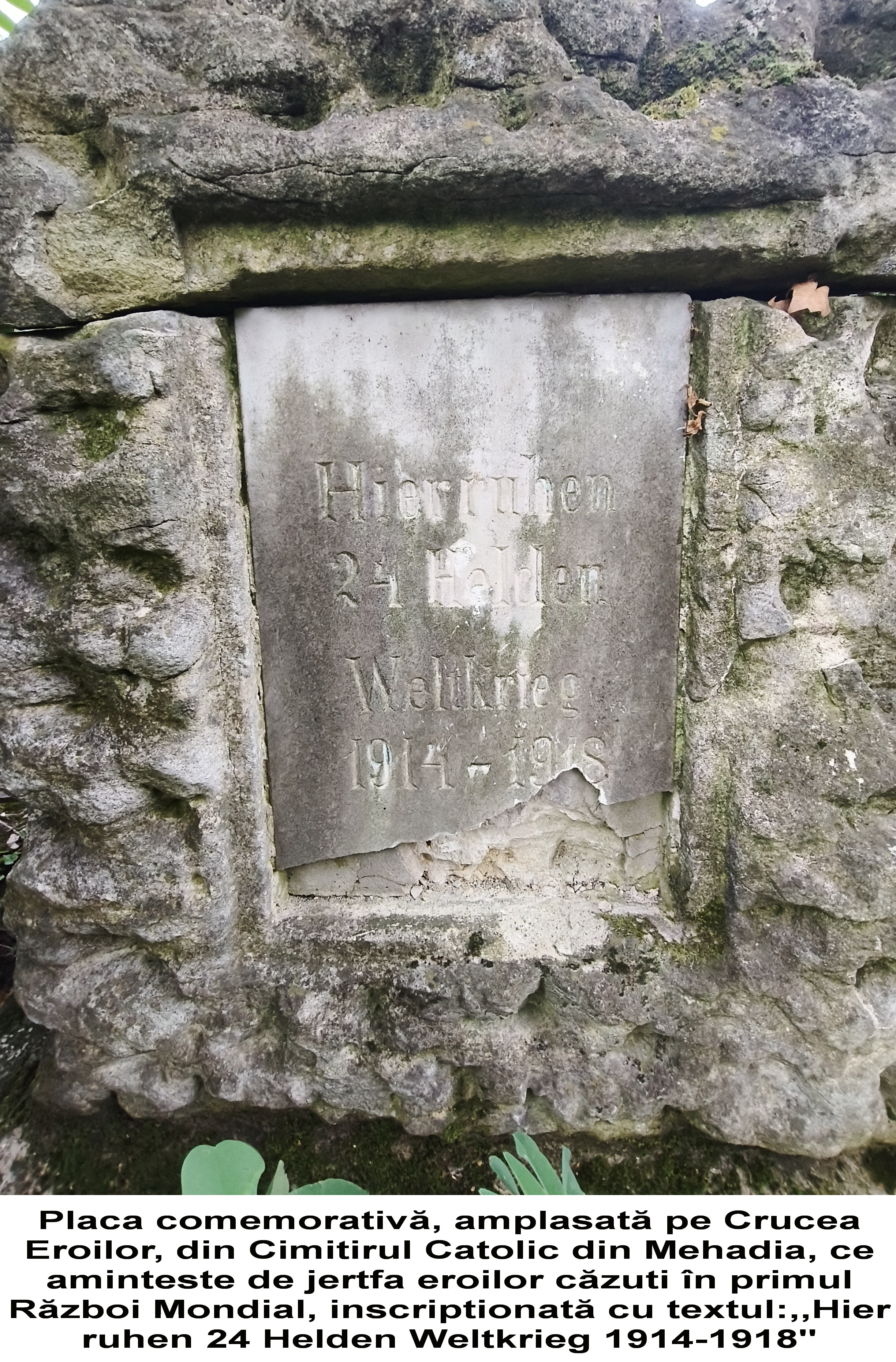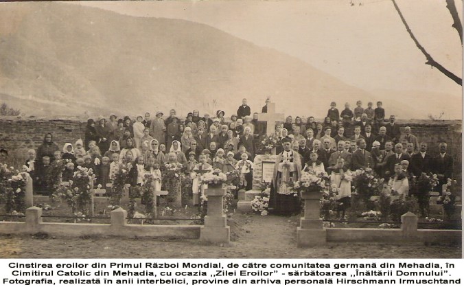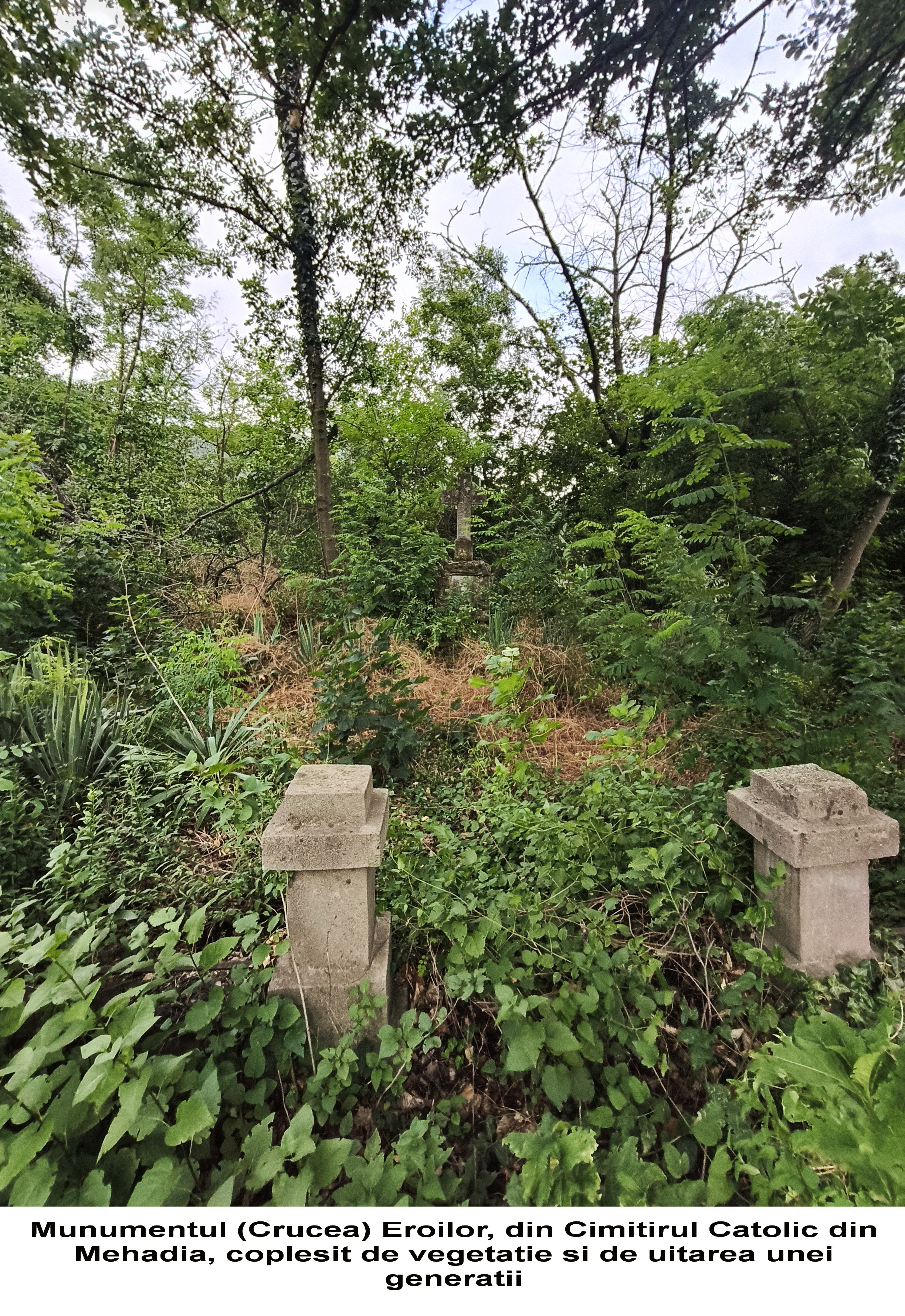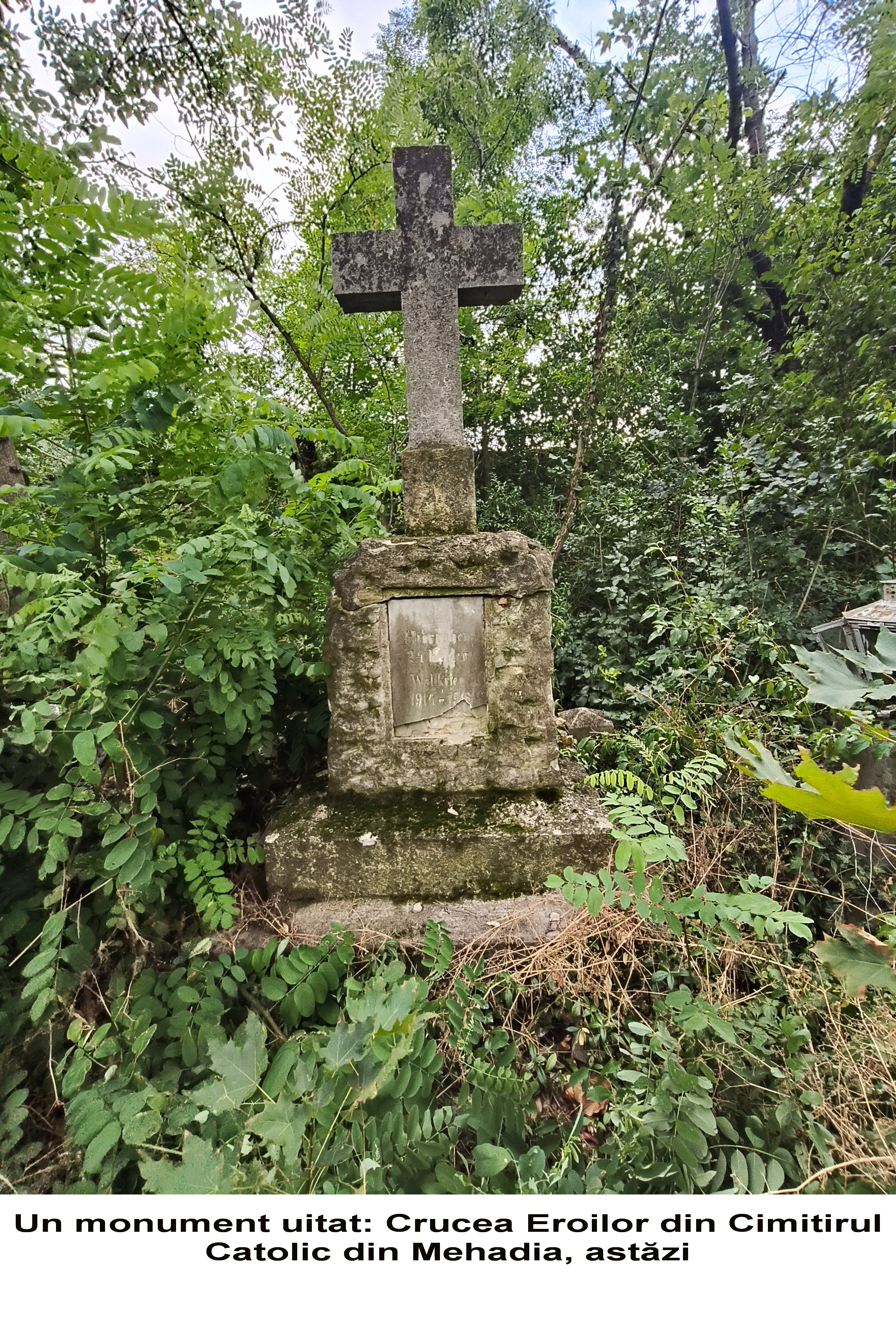 În acest context, un exemplu grăitor, care îmi va întări această afirmație, îl voi prezenta în cele ce urmează. Pentru a-mi argumenta și întări afirmațiile, am apelat la probele vizuale atașate: una dintre ele, cea veche, aparține unui timp trecut, plasat undeva în anii interbelici. Fotografia prezintă o adunare comemorativă a comunității germane, din Mehadia, la Monumentul (Crucea) Eroilor din Primul Război Mondial, amplasat în incinta Cimitirului Catolic din Mehadia. Fotografia provine din arhiva personală a unuia dintre ultimii descendenți al vechilor familii de etnici germani stabiliți la Mehadia, pe nume Hirschmann Irmuschtand (cunoscută de localnici sub numele de ,,domnișoara Irma”- o persoană extrem de respectată în comunitate!), decedată în urmă cu câțiva ani, la o venerabilă vârstă. Adunarea respectivă, una devenită tradițională, aduna comunitatea catolică, în ziua de Înălțarea Domnului, pentru comemorarea și pomenirea eroilor. Dintr-un interes legat de aceste tradiții uitate, am întreprins o incursiune în incinta Cimitirului Catolic, pentru a identifica respectivul monument. În urma unei căutări insistente, am reușit într-un final să identific amplasamentul, monumentul fiind ascuns vederii, în umbra vegetației, a bălăriilor și… a uitării. O placă comemorativă, în parte degradată, dezvăluie textul, încă lizibil: ,,Hier ruhen 24 Helden Weltkrieg 1914-1918”, în traducere în limba română: ,,Aici odihnesc 24 de eroi ai Războiului Mondial 1914-1918”. Oricât m-aș strădui să fiu de îngăduitor în sine cu această situație, nu pot să nu mă întreb: Cum am putut permite ca un asemenea simbol, purtător de istorie și de amintiri, să ajungă în acest hal de neglijare? Este profund descurajant și, sincer, revoltător să vezi cum memoria unor oameni care și-au dat viața pentru idealurile unui popor și ale unei comunități, este lăsată pradă indiferenței, acoperită de buruieni și de uitare. Această imagine nu reflectă doar starea unui monument, ci, într-un mod dureros, indiferența crescândă față de propriul trecut și față de contribuția unei comunități, care a adus un aport semnificativ la clădirea identității acestui spațiu. Simt o profundă tristețe și o nemulțumire amară văzând cum nepăsarea erodează nu doar piatra, ci și fibra memoriei colective a Mehadiei.