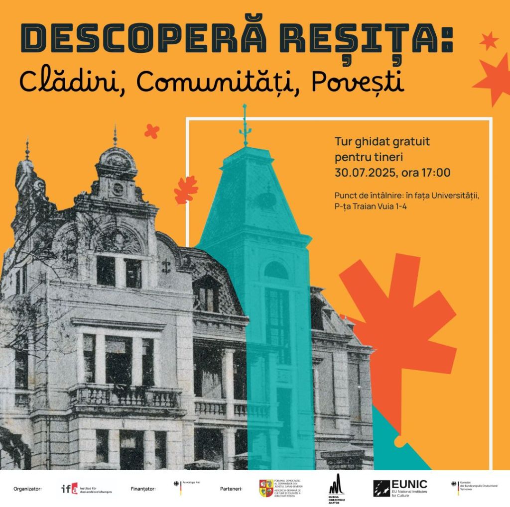 Descoperă Reșița: Clădiri, comunități, povești: tur interactiv pentru tineri despre Reșița de altădată, condus de Ioana Ciolea. După tur, workshop creativ de linogravură, unde tinerii vor putea realiza propriile printuri pe tricouri sau sacoșe.