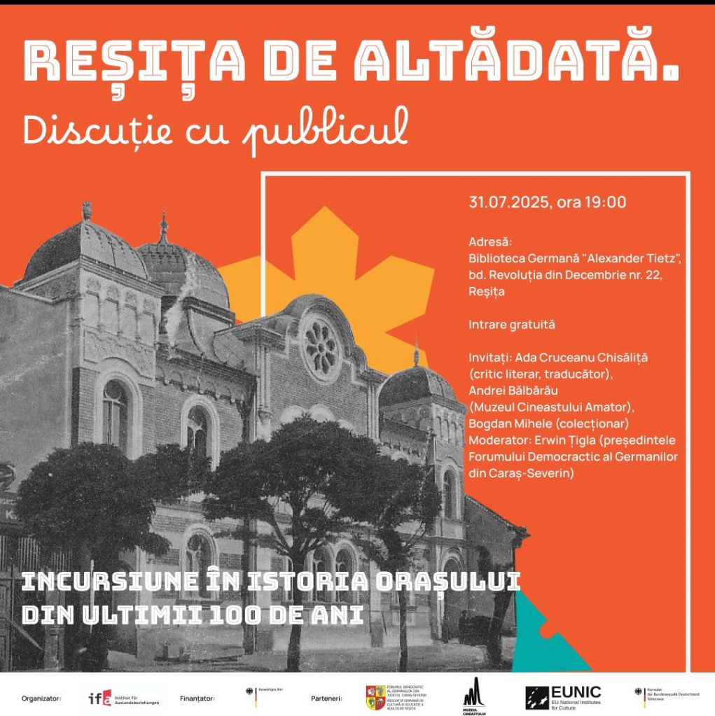 Reschitza von gestern. Veränderungen des Stadtgefüges in den letzten 100 Jahren: Podiumsdiskussion über die radikalen Änderungen, die Reschitza in den letzten 100 Jahren erlebt hat, mit Andrei Florin Bălbărău (Museum des freiwilligen Filmemachers), Ada Cruceanu-Chisăliță (Literaturkritikerin und Übersetzerin), Bogdan Andrei Mihele (Sammler) und Erwin Josef Ţigla (Vorsitzender des Demokratischen Forums der Banater Berglanddeutschen).