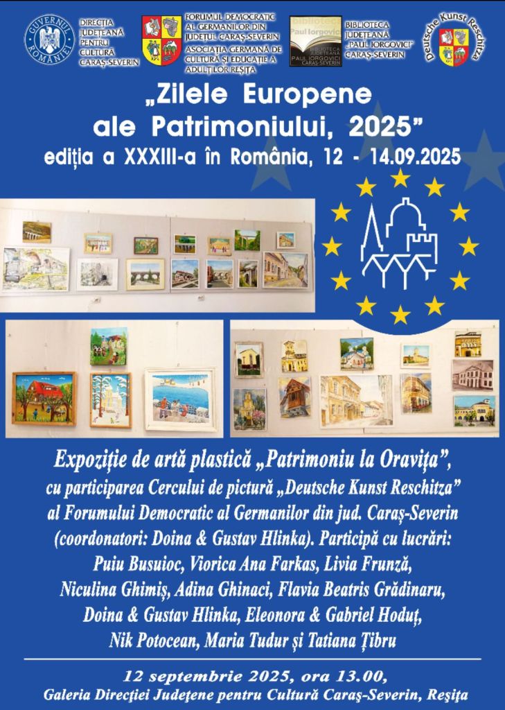 „Europäische Tage des Patrimoniums, 2025 / 12. – 14. September”, XXXIII. Auflage in Rumänien, organisiert zum Thema „Architekturgeschichten“: Kunstausstellung „Patrimonium in Orawitza“, mit Arbeiten des Kreises „Deutsche Kunst Reschitza“ des Demokratischen Forums der Banater Berglanddeutschen (Koordinatoren: Doina & Gustav Hlinka). Es beteiligen sich folgende Künstler: Puiu Busuioc, Viorica Ana Farkas, Livia Frunză, Niculina Ghimiș, Adina Ghinaci, Flavia Beatris Grădinaru, Doina & Gustav Hlinka, Eleonora & Gabriel Hoduț, Nik Potocean, Maria Tudur und Tatiana Țibru.