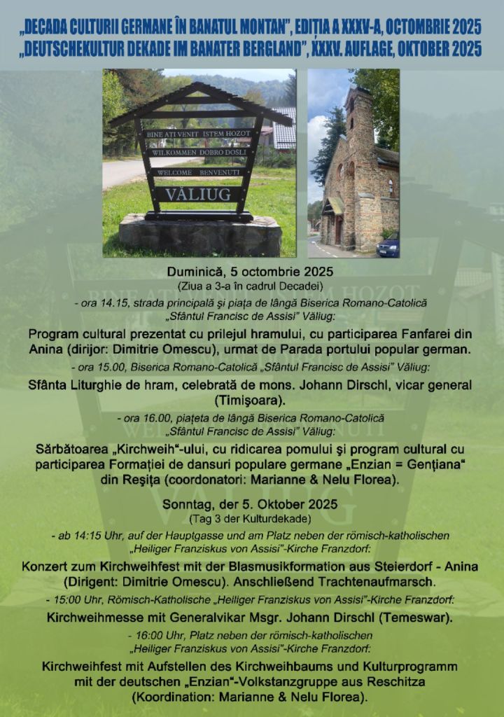5 octombrie 2025, ora 16.00, piațeta de lângă Biserica Romano-Catolică „Sfântul Francisc de Assisi” Văliug: