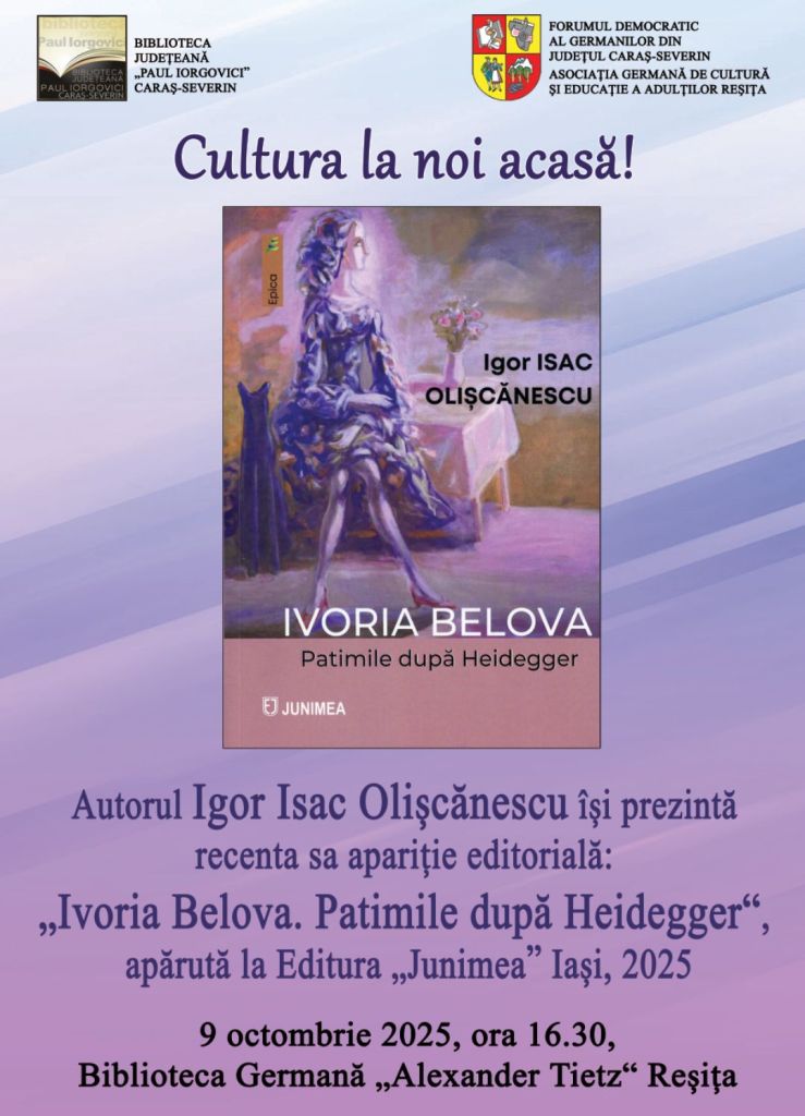 Die Kultur bei uns im Hause: der Autor Igor Isac Olișcănescu stellt seine neuesten Buchveröffentlichungen vor: „Ivoria Belova. Patimile după Heidegger“, erschienen im „Junimea”-Verlag Jassy, 2025.