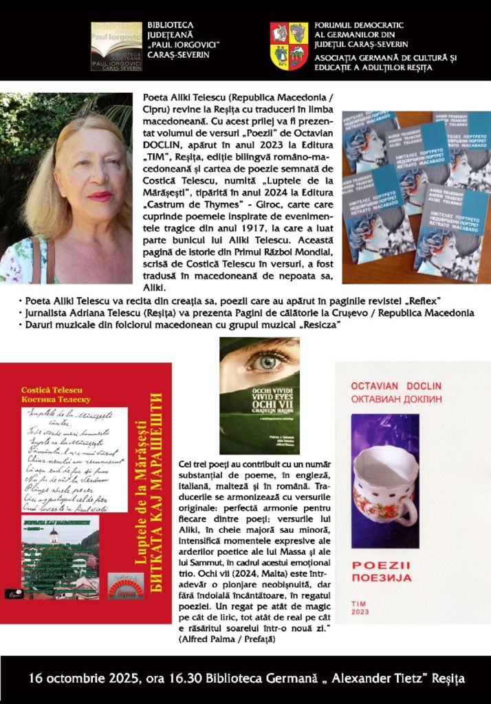 16 octombrie 2025, ora 16.30, Biblioteca Germană „Alexander Tietz“ Reșița: