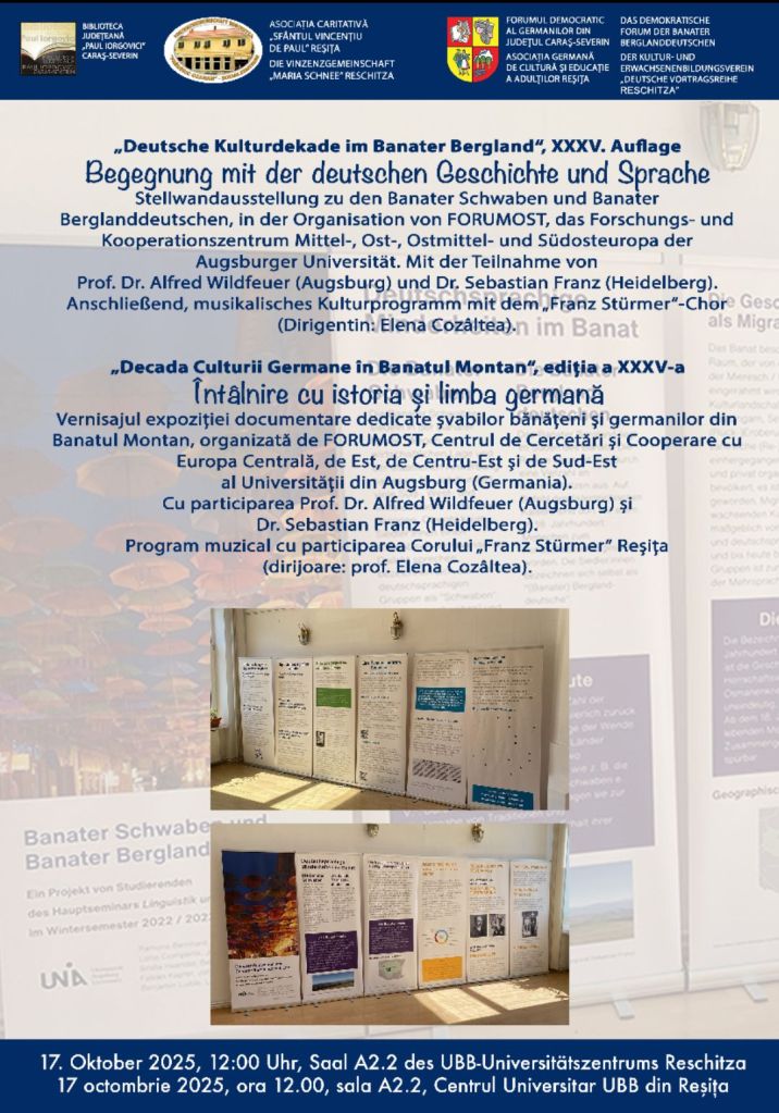 Stellwandausstellung zu den Banater Schwaben und Banater Berglanddeutschen, in der Organisation von FORUMOST, das Forschungs- und Kooperationszentrum Mittel-, Ost-, Ostmittel- und Südosteuropa der Augsburger Universität. Mit der Teilnahme von Prof. Dr. Alfred Wildfeuer (Augsburg) und Dr. Sebastian Franz (Heidelberg).