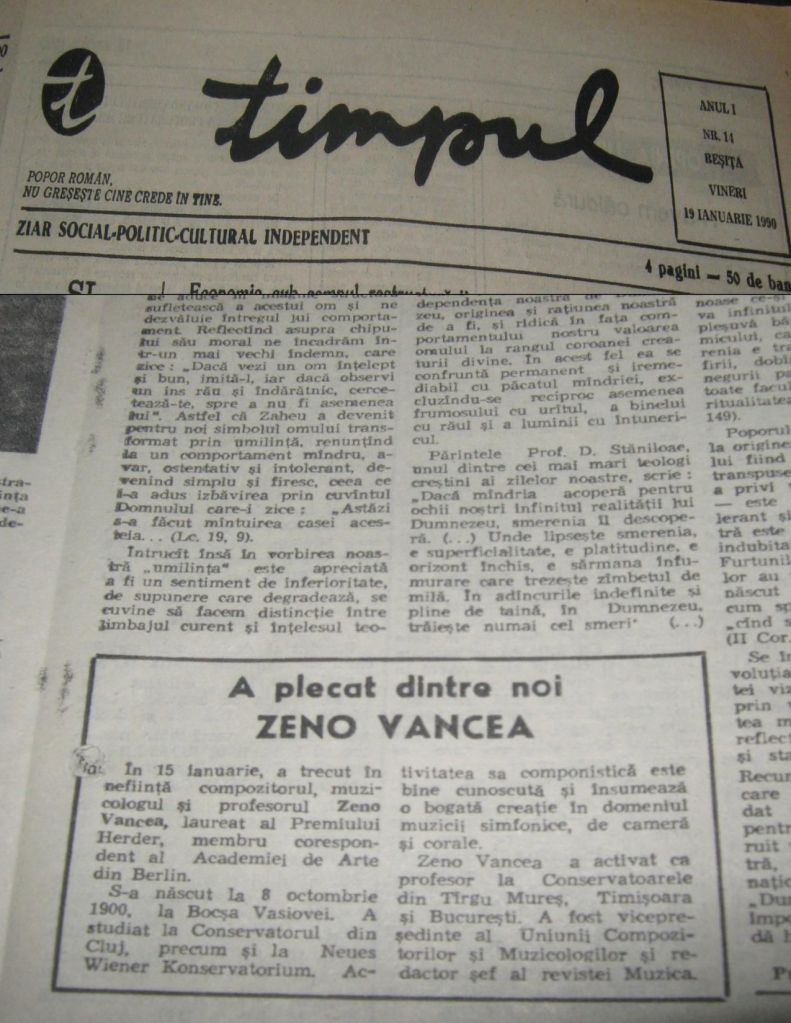 Compozitor, muzicolog, profesor, Cetățean de onoare al orașului Bocșa, Zeno Vancea s-a născut în 8 octombrie 1900 la Bocşa Vasiova, Caraş-Severin, şi a murit la 15 ianuarie 1990 la Bucureşti. Deși lugojean, s-a născut la Bocșa, în casa pictorului Filip Matei unde părinţii săi locuiau cu chirie. Au venit la Bocșa cu câteva luni înaintea nașterii, deoarece la Bocșa profesa renumitul doctor Petru Borlovan, iar dorința doamnei Vancea era să fie asistată la naștere de acesta. După patru luni de la naștere, familia s-a reîntors la Lugoj. „ Ei bine, puțini știu că locul meu de naștere e tot o așezare rustică caraș-severineană, sălbatică, dar pitorească, cu dealuri și văi ispititoare, consacrată în timp și de o revistă a bucolicului Tata Oancea: Vasiova. Așadar, «am intrat în lume» în mult îndrăgita de mine Bocșa Vasiova… Cu timpul ne-am stabilit întreaga familie la Lugoj, unde trăiau bunicii dinspre tată.”[2]
