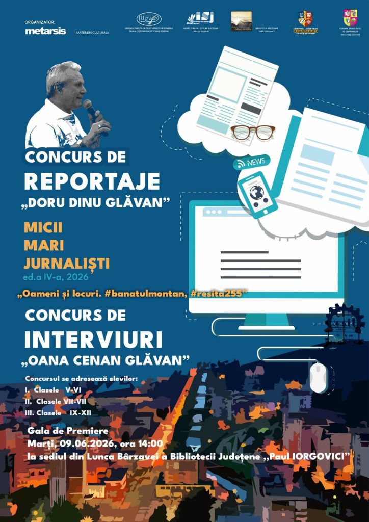 Dăm startul celei de-a IV-a ediții a Concursului de reportaje „DORU DINU GLĂVAN” și a celui de interviuri „ OANA CENAN GLĂVAN” sub genericul „Mici mari jurnalişti”, ed. a IV-a, 2026, „Oameni și locuri. #banatulmontan, #resita255″