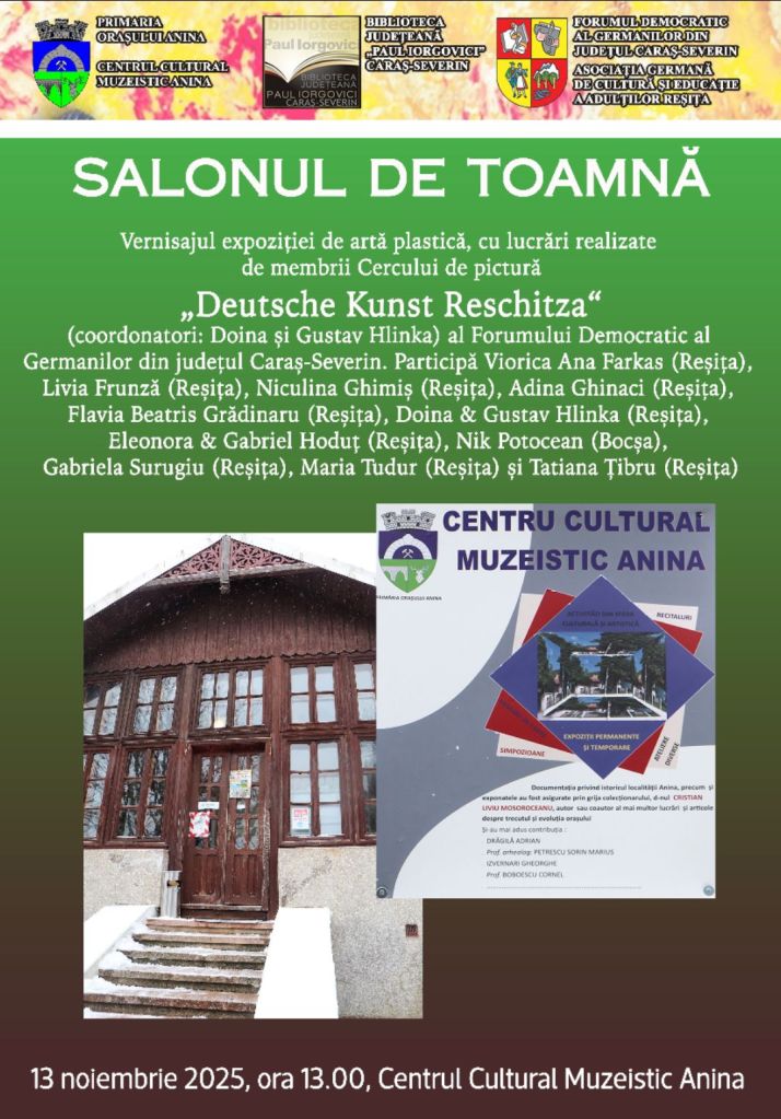 Herbst-Kunstsalon: Vernissage mit Arbeiten des Kreises „Deutsche Kunst Reschitza“ des Demokratischen Forums der Banater Berglanddeutschen (Koordination: Doina & Gustav Hlinka). Es stellen aus: Viorica Ana Farkas (Reschitza), Livia Frunză (Reschitza), Adina Ghinaci (Reschitza), Flavia Beatris Grădinaru (Reschitza), Niculina Ghimiș (Reschitza), Doina & Gustav Hlinka (Reschitza), Eleonora & Gabriel Hoduț (Reschitza), Nik Potocean (Bokschan), Gabriela Surugiu (Reschitza), Maria Tudur (Reschitza) und Tatiana Țibru (Reschitza).