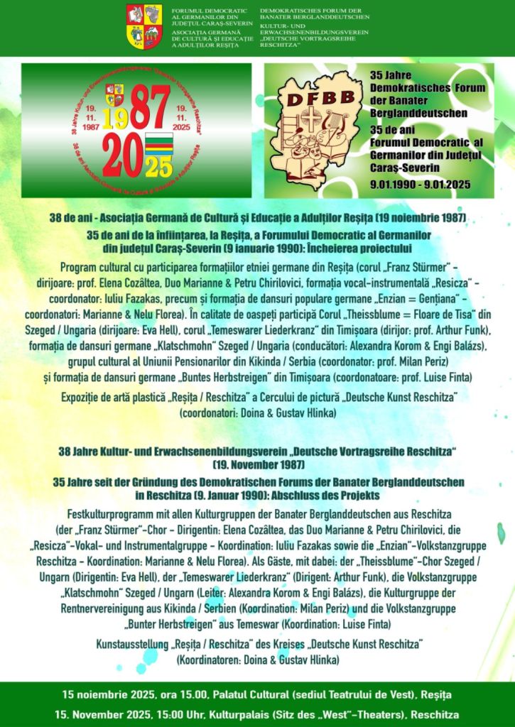 Festkulturprogramm mit allen Kulturgruppen der Banater Berglanddeutschen aus Reschitza (der „Franz Stürmer“-Chor – Dirigentin: Elena Cozâltea, das Duo Marianne & Petru Chirilovici, die „Resicza“-Vokal- und Instrumentalgruppe – Koordination: Iuliu Fazakas sowie die „Enzian“-Volkstanzgruppe Reschitza – Koordination: Marianne & Nelu Florea). Als Gäste, mit dabei: der „Theissblume“-Chor Szeged / Ungarn (Dirigentin: Eva Hell), der „Temeswarer Liederkranz“ (Dirigent: Arthur Funk), die Volkstanzgruppe „Klatschmohn“ Szeged / Ungarn (Leiter: Alexandra Korom & Engi Balázs), die Kulturgruppe der Rentnervereinigung aus Kikinda / Serbien (Koordination: Milan Periz) und die Volkstanzgruppe „Bunter Herbstreigen“ aus Temeswar (Koordination: Luise Finta).
