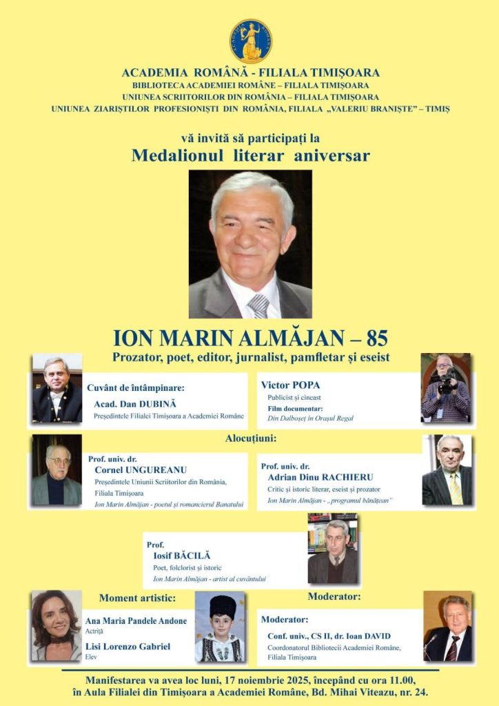 Luni, 17 noiembrie, începând cu ora 11, la Academia Română Filiala Timișoara, va avea loc manifestarea „Medalion literar aniversar” în cadrul căreia va fi sărbătorit Domnul Ion Marin Almăjan.