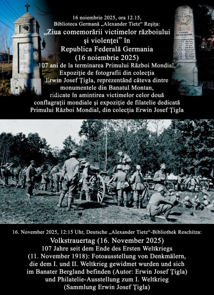 107 Jahre seit dem Ende des Ersten Weltkriegs (11. November 1918): Fotoausstellung von Denkmälern, die dem I. und II. Weltkrieg gewidmet wurden und sich im Banater Bergland befinden (Autor: Erwin Josef Țigla) und Philatelie-Ausstellung zum I. Weltkrieg (Sammlung Erwin Josef Țigla).