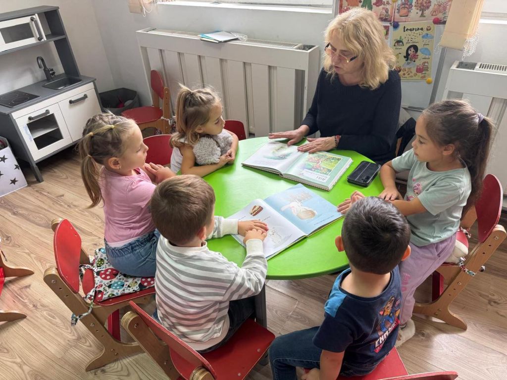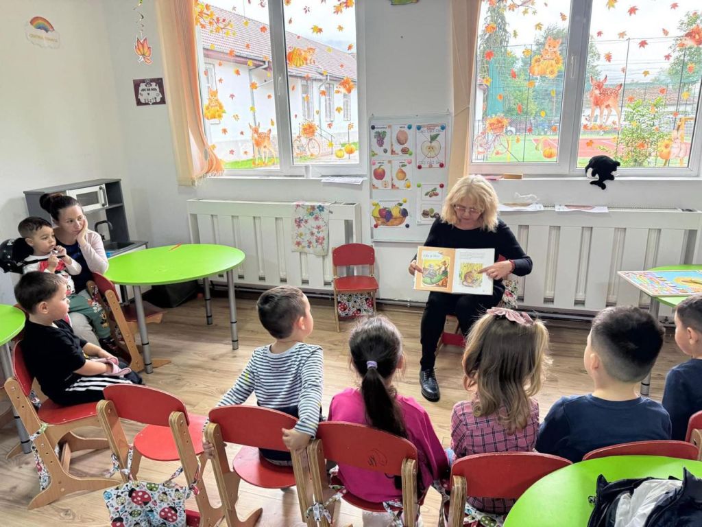 La nivelul grădiniței, doamna bibliotecară le citește povești, copiii identifică personajele, iar pe baza unor imagini sunt stimulați să povestească și să pună în ordine evenimentele poveștii.