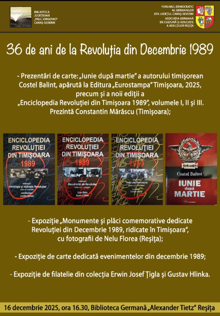 Buchpräsentationen: „Iunie după martie” (= „Juni nach März”) des Temeswarer Autors Costel Balint, erschienen im „Eurostampa”-Verlag Temeswar, 2025, sowie der Neuauflagen der Serie „Enciclopedia Revoluției din Timișoara 1989” (= „Die Enzyklopädie der Temeswarer Revolution von 1989”), Band I, II und III. Es stellt vor Constantin Mărăscu (Temeswar);