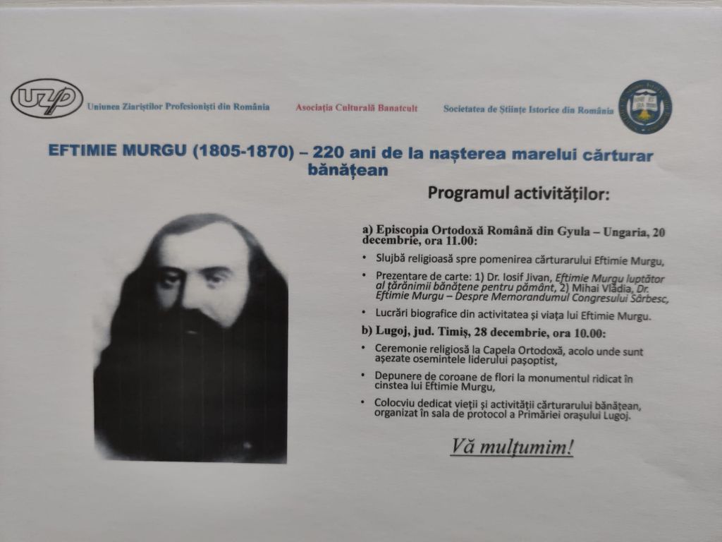 220 de ani de la nașterea marelui cărturar bănățean Eftimie Murgu (1805-1870), un eveniment desfășurat cu sprijinul Uniunii Ziariștilor Profesioniști din România, Asociația Culturală BanatCult și Societatea de Științe Istorice din România.