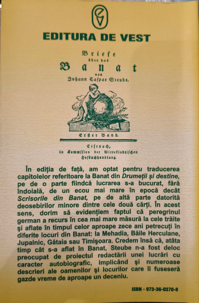 Una dintre lucrările amintite mai sus, asupra căreia doresc sa mă aplec puțin, este „Nouă ani în Banat (1772–1781)„, a lui Johann Kaspar Steube. Mulțumesc, din nou, domnului Costin Feneșan pentru că mi-a dăruit-o, cu ocazia întâlnirii noastre de la Caransebeș!