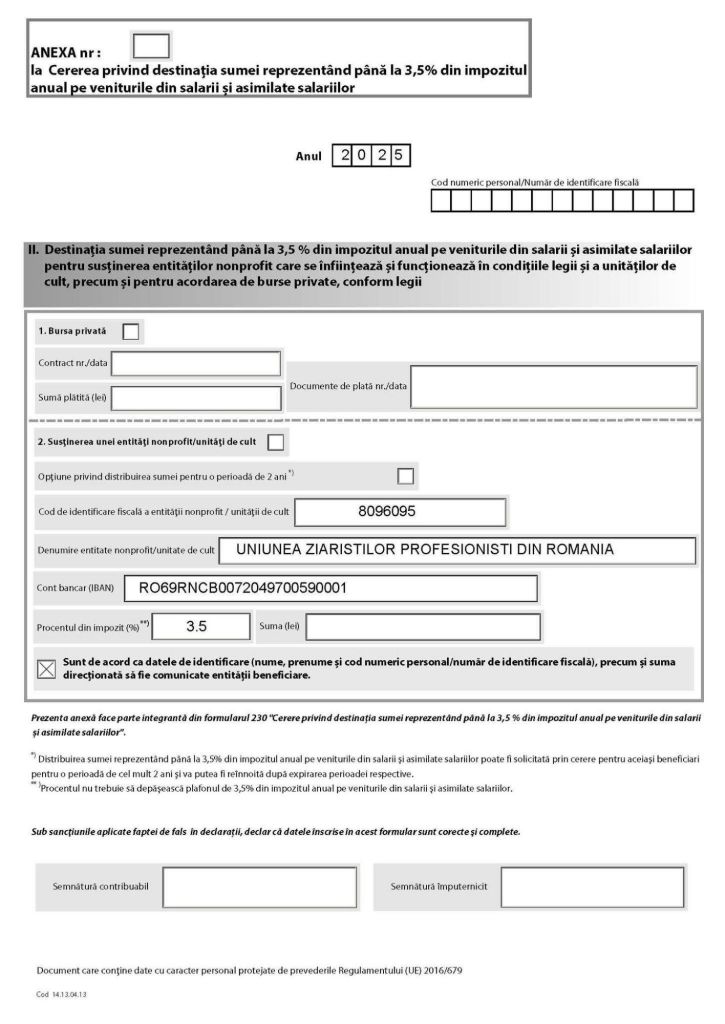 Pentru a redirecționa către Uniunea Ziariștilor Profesioniști din România a 3,5% din impozitul anual datorat, se descarcă formularul, se printează, se completează cu datele personale, se scanează și se trimite pe adresa UZPR – Bulevardul General Gheorghe Magheru, nr. 28-30, București, 010336 – prin poștă sau curier.