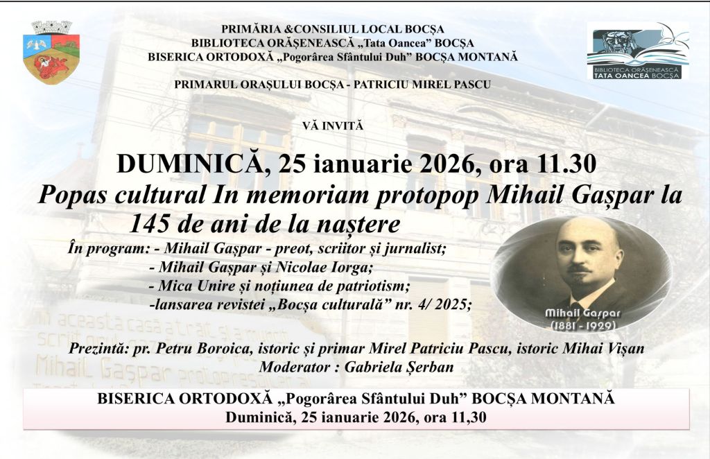 Duminică, 25 ianuarie 2026, la Biserica Ortodoxă cu hramul „Pogorârea Sfântului Duh” din Bocșa Montană a avut loc un eveniment gândit de către Biblioteca Orășenească „Tata Oancea” în proiectul „Să ne prețuim valorile!” – un popas cultural in memoriam protopop și scriitor Mihail Gașpar la 145 de ani de la nașterea acestuia.
