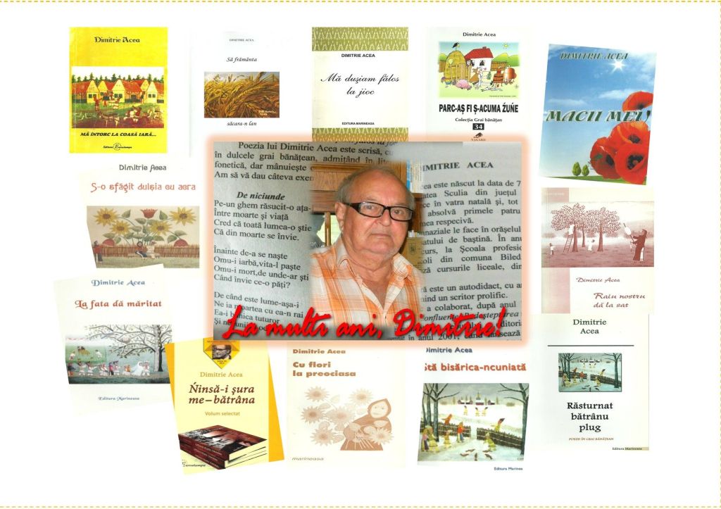 Și, pentru că azi se află la ceas aniversar, îi transmitem prietenului Dimitrie Acea alese gânduri de bine și sănătate și-i dorim încă multe momente de bucurie și satisfacție oferite de către cititorii cărților sale.