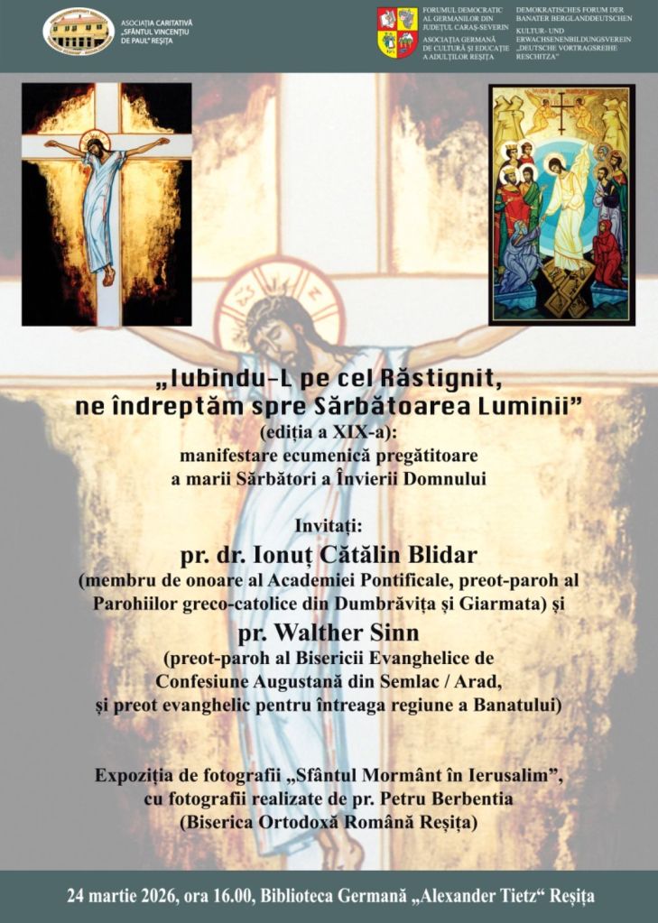 „Den Gekreuzigten liebend“ (XIX. Auflage): Ökumenische Vorbereitungsveranstaltung zum Osterfest, mit Pfr. Dr. Ionuț Cătălin Blidar (Ehrenmitglied der Päpstlichen Akademie, Pfarrer der Griechisch-Katholischen Pfarreien Dumbrăvița und Jahrmarkt) und Pfr. Walther Sinn (Pfarrer der Evangelischen Kirche Augsburger Bekenntnisses in Semlak / Arad und zuständig für das gesamte Banat).