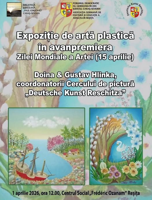 Încheind, să spunem și noi că Ziua Mondială a Artei, din 15 aprilie 2026, va fi marcată de Biblioteca Germană „Alexander Tietz”, Reșița, printr-un maraton de vernisaje expoziționale organizate în orașele județului Caraș-Severin.