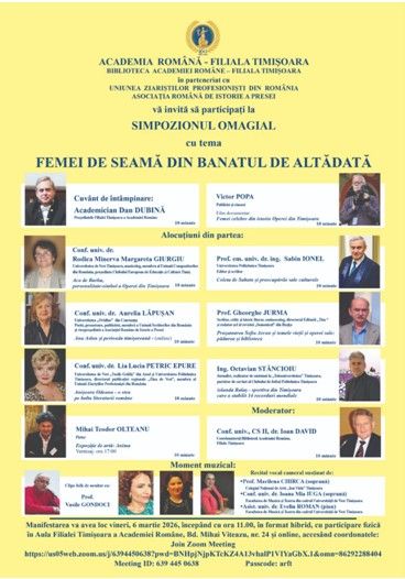 De mare importanță este parteneriatul, care continuă și în acest an, cu Academia Română, Filiala Timișoara. În acest sens, într-o bună colaborare s-a organizat, în ziua de 6 martie, un simpozion omagial, cu tema: „Femei de seamă din Banatul de altădată”. Au fost evocate personalitatea și activitatea deosebită a regretatei Aca de Barbu, (o personalitate simbol pentru Opera din Timișoara), Ana Aslan (mai ales din perioada petrecută la Timișoara), scriitoarea Anișoara Odeanu, prof. dr.ing. Coleta de Sabata (mai ales pentru preocupările culturale), prozatoarea Sofia Arcan și, respectiv sportiva care a stabilit 14 recorduri mondiale, timișoreanca Iolanda Balaș. Astfel, publicul a audiat expunerile interesante ale: conf. univ. dr. Rodica Minerva Margareta Giurgiu, prof. em. univ. dr. ing. Sabin Ionel, conf. univ. dr. Aurelia Lăpușan, conf. univ. dr. Lia Lucia Petric Epure, ing. Octavian Stăncioiu. În program a fost cuprinsă și vizionarea filmului documentar intitulat „Femei celebre din istoria Operei din Timișoara”, precum și o frumoasă expoziție personală de pictură, intitulată „Anima”, realizată de talentatul artist Mihai Teodor Oltenu. Ca de obicei, în calitate de gazdă s-a adresat în deschiderea evenimentului Academicianul Dan Dubină, președintele filialei Academiei, iar moderator a fost conf. univ. CS II, dr. Ioan David.