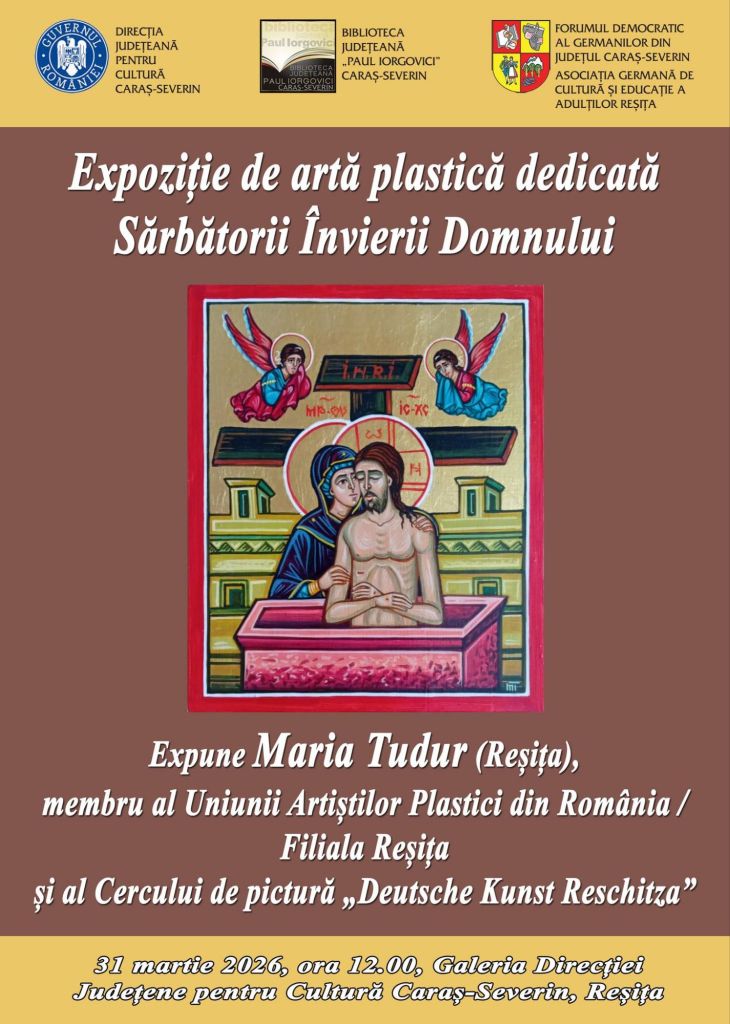 În această săptămână, de sfârșit de martie și început de aprilie în care înseși natura ne trezește simțurile îmbiindu-ne să admirăm policromia înfloririlor, am avut parte de un spectacol al culorii pe pânză. Așadar, în 31 martie 2026, Maria Tudur, membră a Uniunii Artiștilor Plastici din România/Filiala Reșița și a Cercului de Pictură „Deutsche Kunst Reschitza”, din cadrul Forumului Democratic al Germanilor din România, ne reunește la Galeria Direcției Județene pentru Cultură Caraș-Severin, Reșița, la vernisajul expoziției de artă plastică dedicată Sărbătorii Învierii Domnului. Fericit prilej pentru ca domnul director al Direcției Județene pentru Cultură Caraș-Severin, Trifu Vuița, în calitate de gazdă, a rostit un cuvânt de bun-venit celor veniți să participe la consacrarea unui nou eveniment cu valoare cultural-artistică.