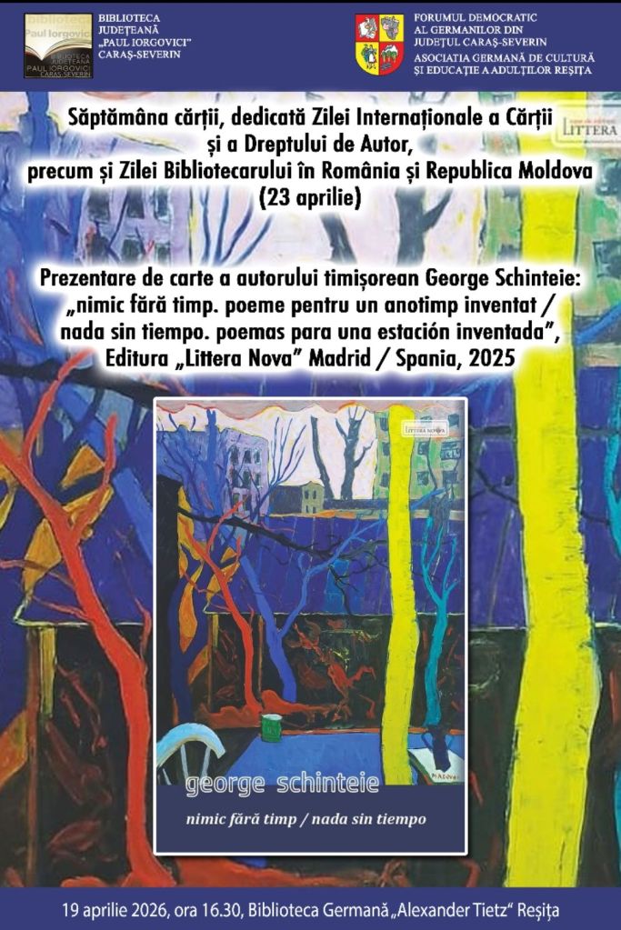 Buchpräsentation: als Gast der Temeswarer Schriftsteller George Schinteie und seine neueste Buchveröffentlichung, „nimic fără timp. poeme pentru un anotimp inventat / nada sin tiempo. poemas para una estación inventada”, Verlag „Littera Nova” Madrid / Spanien, 2025.