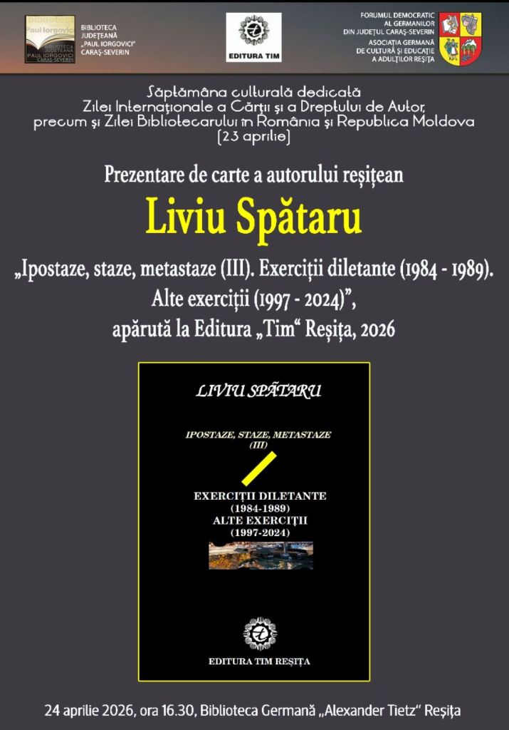 Buchpräsentation: als Gast der Reschitzaer Schriftsteller Liviu Spătaru und seine neueste Buchveröffentlichung: „Ipostaze, staze, metastaze (III). Exerciții diletante (1984 – 1989). Alte exerciții (1997 – 2024)” (= „Hypostasen, Stasen, Metastasen (III). Dilettantenübungen (1984 – 1989). Weitere Übungen (1997 – 2024)”, erschienen im Verlag „Tim“ Reschitza, 2026.