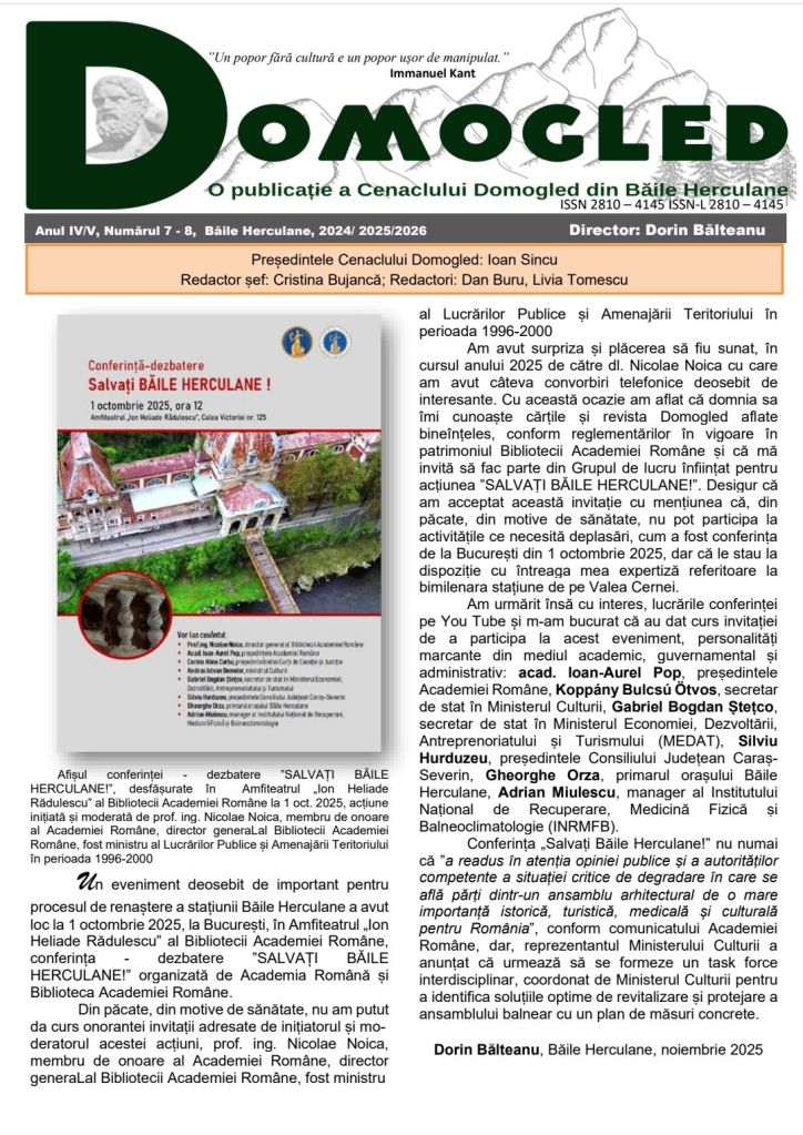 În esență, DOMOGLED depășește formatul unei simple reviste; este o mărturie vie a dragostei pentru patrimoniu și un „străjer” al viitorului stațiunii Băile Herculane. Această ediție de colecție rămâne o dovadă incontestabilă a rezilienței culturale și a efortului admirabil al domnului Dorin Bălteanu de a nu lăsa flacăra „Domogledului” să se stingă.